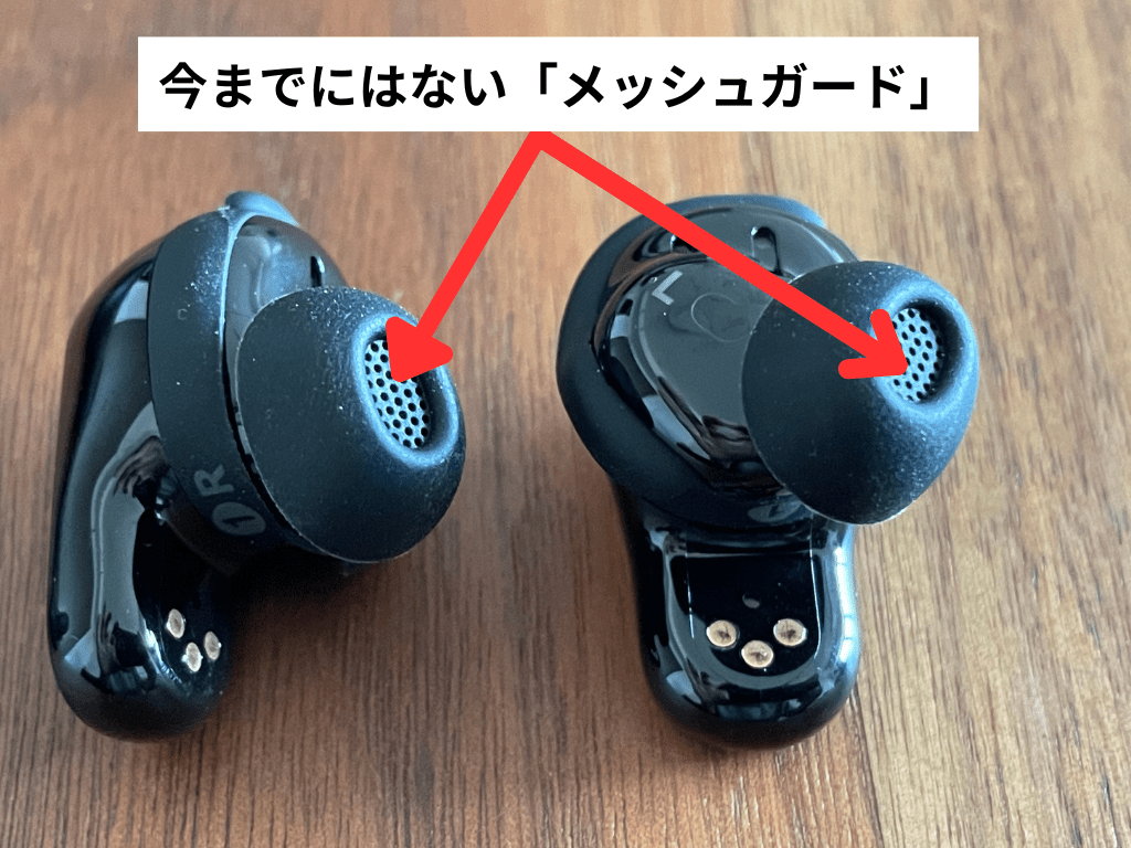 本体イヤホンの裏側も大きな変化は無いようです。あ!新しい「Bose quietcomfort ultra earbuds gen 2(第二世代)」にはイヤホンの耳に入れる部分にメッシュガードがついている!この記事書いている時初めて気づいた(汗)↓